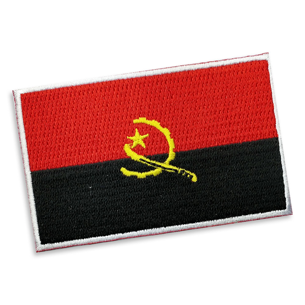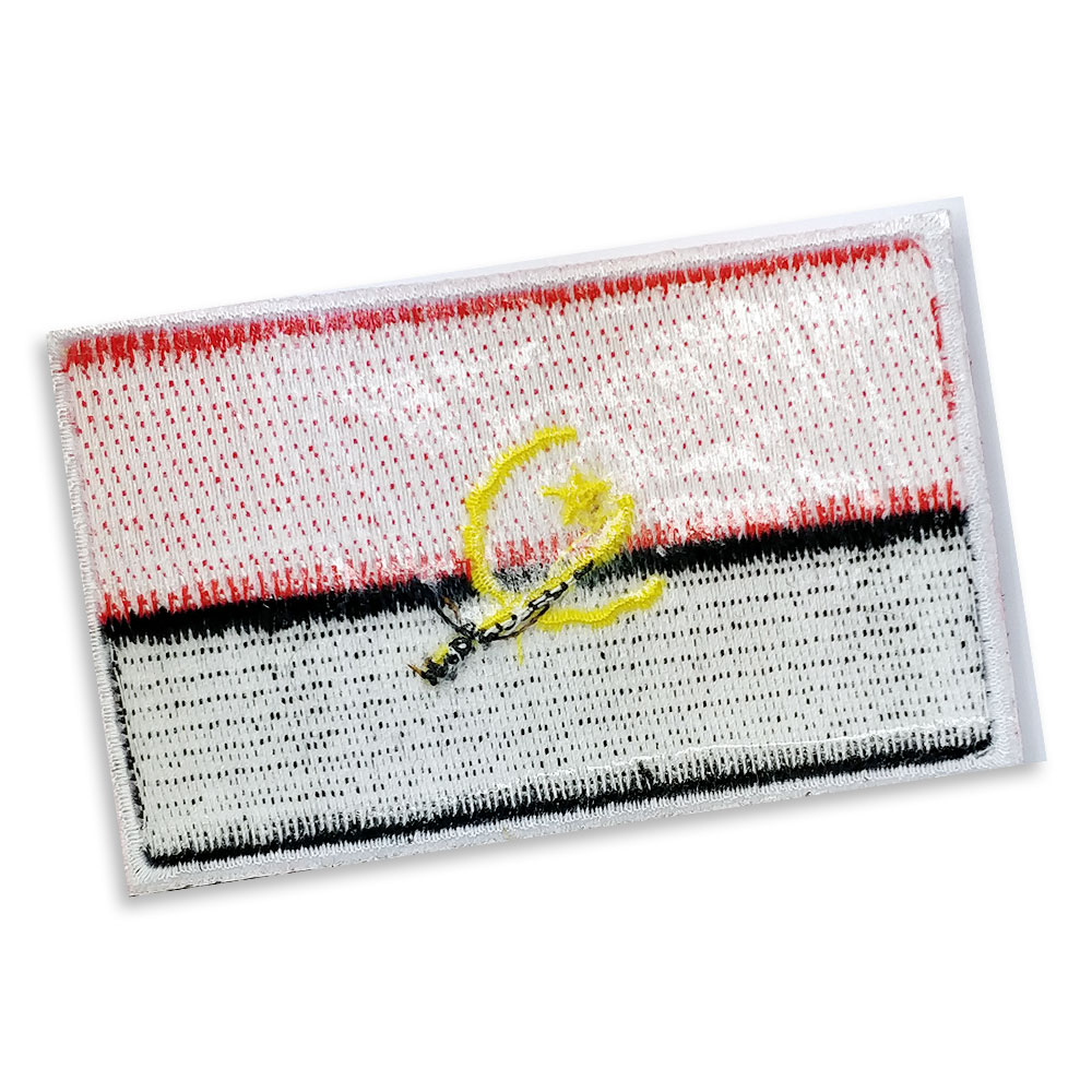 Angola Embroidered flag badge with heat seal backing RED PANTONE: PMS 186 C HEX (HTML): #C8102E; RGB: (200 16 46) CMYK: (2 100 85 6) YELLOW PANTONE: PMS 116 C HEX (HTML): #FFCD00; RGB: (255 205 0) CMYK: (0 14 100 0) BLACK HEX (HTML): #000000; RGB: (0,0,0) CMYK: (0,0,0,100)