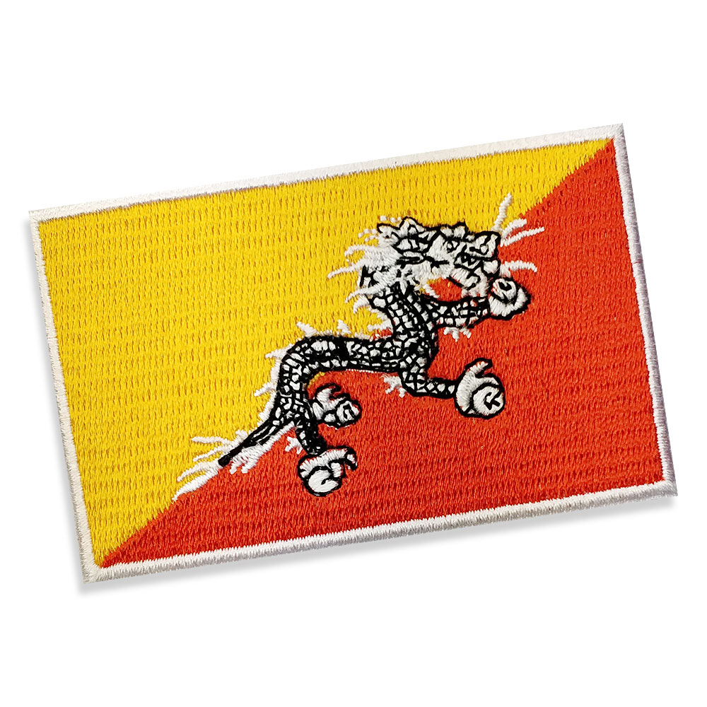 Bhutan Embroidered flag badge with heat seal backing ORANGE PANTONE: PMS 165 C HEX (HTML): #FF4E12; RGB: (255 103 31) CMYK: (0 70 100 0) YELLOW PANTONE: PMS 116 C HEX (HTML): #FFCD00; RGB: (255 205 0) CMYK: (0 14 100 0)