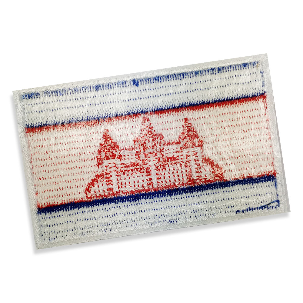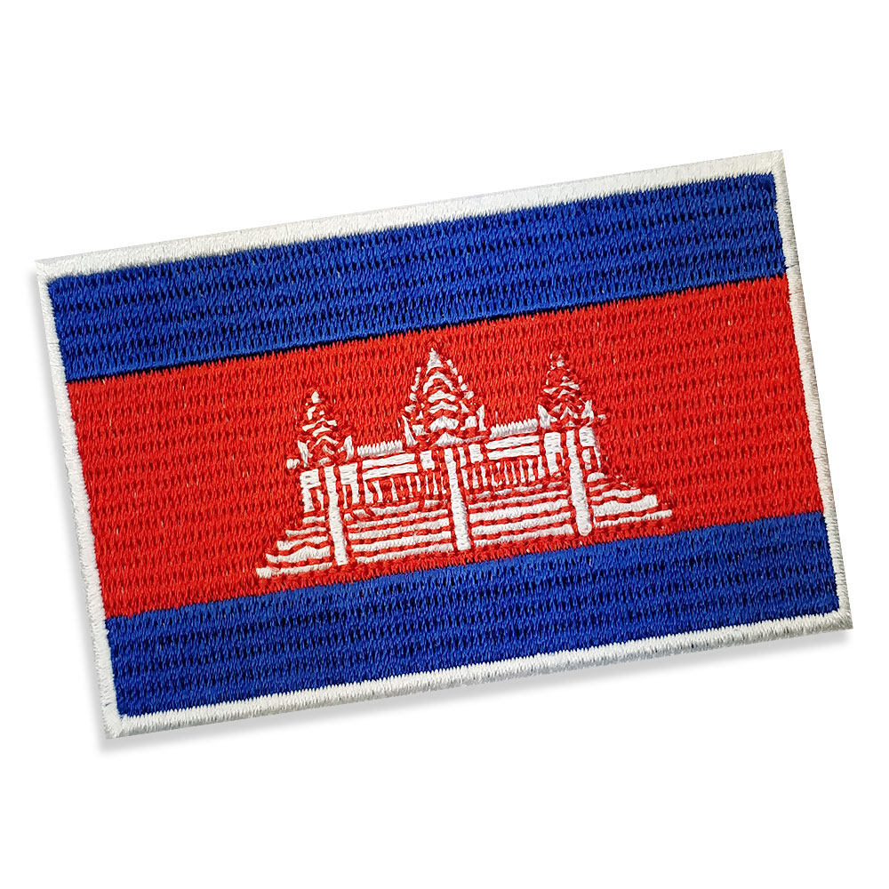 Cambodia Embroidered flag badge with heat seal backing BLUE PANTONE: PMS 072 C HEX (HTML): #032EA1; RGB: (251 225 34) CMYK: (98 71 0 37) RED PANTONE: PMS 185 C HEX (HTML): #E00025; RGB: (224 0 37) CMYK: (0 100 83 12)