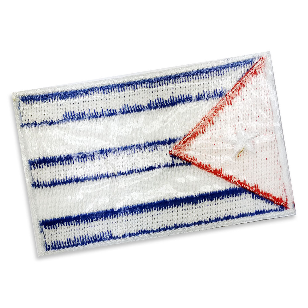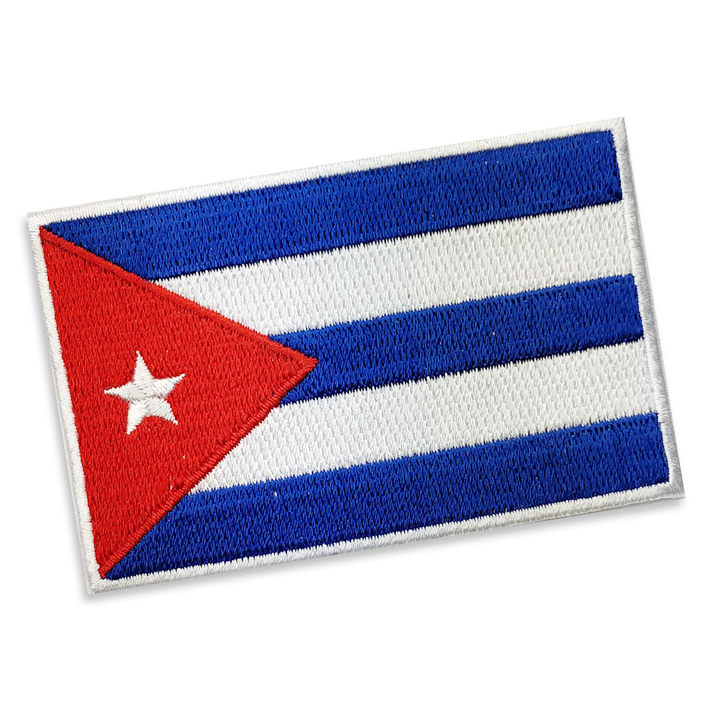 Cuba Embroidered flag badge with heat seal backing BLUE PANTONE: PMS 301 C HEX (HTML): #004B87; RGB: (0,75,135) CMYK: (100,53,4,19) RED PANTONE: PMS 485 C HEX (HTML): #DA291C; RGB: (218,41,28) CMYK: (0,95,100,0)