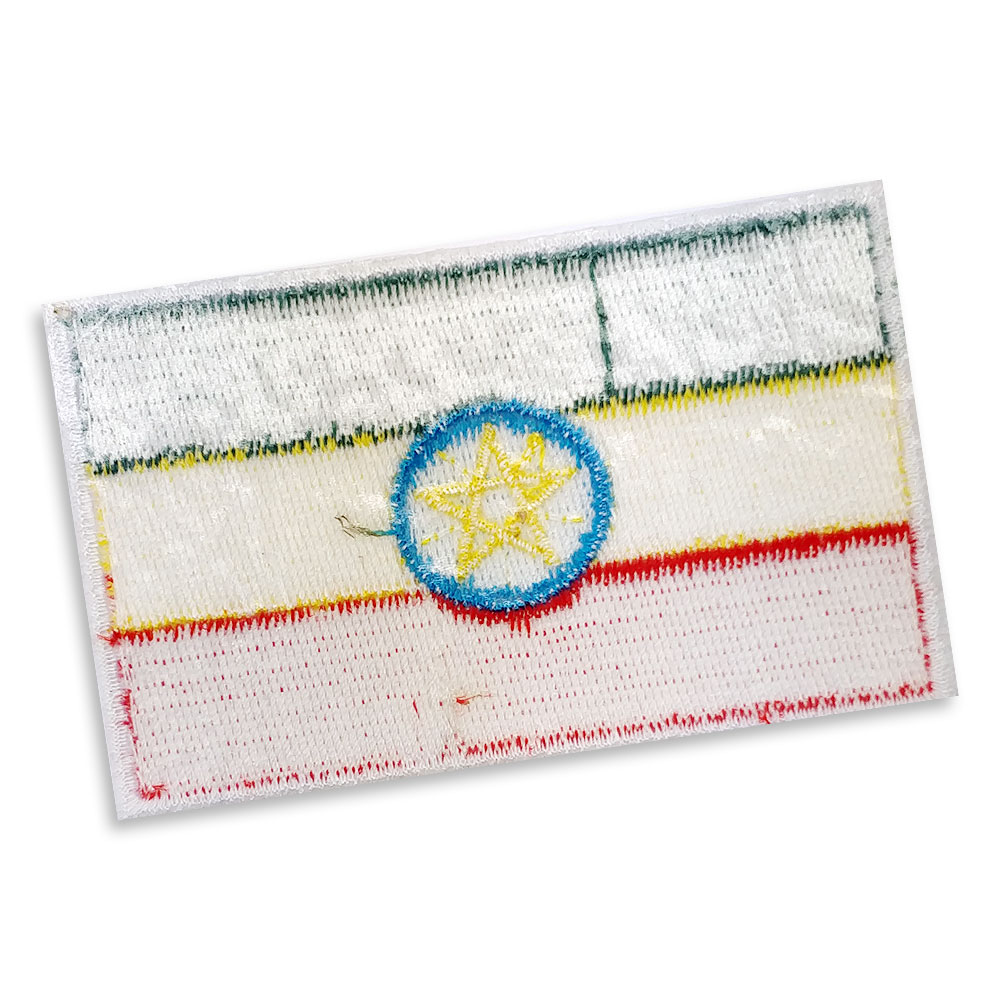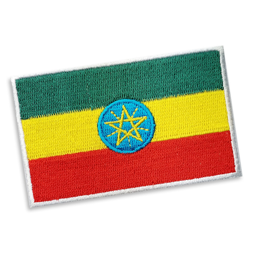 Ethiopia Embroidered flag badge with heat seal backing GREEN PANTONE: PMS 347 C HEX (HTML): #009A44; RGB: (0,154,68) CMYK: (93,0,100,0) YELLOW PANTONE: PMS YELLOW C HEX (HTML): #FEDD00;RGB: (254,221,0) CMYK: (0,1,100,0) RED PANTONE: PMS 032 C HEX (HTML): #EF3340; RGB: (239 51 64) CMYK: (0,86,63,0) BLUE PANTONE: PMS 638 C HEX (HTML): #00AFD7; RGB: (0,175,215) CMYK: (86,0,9,0)