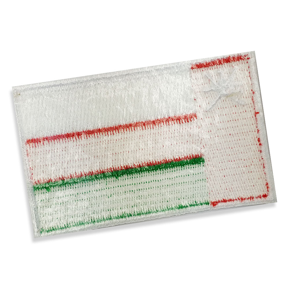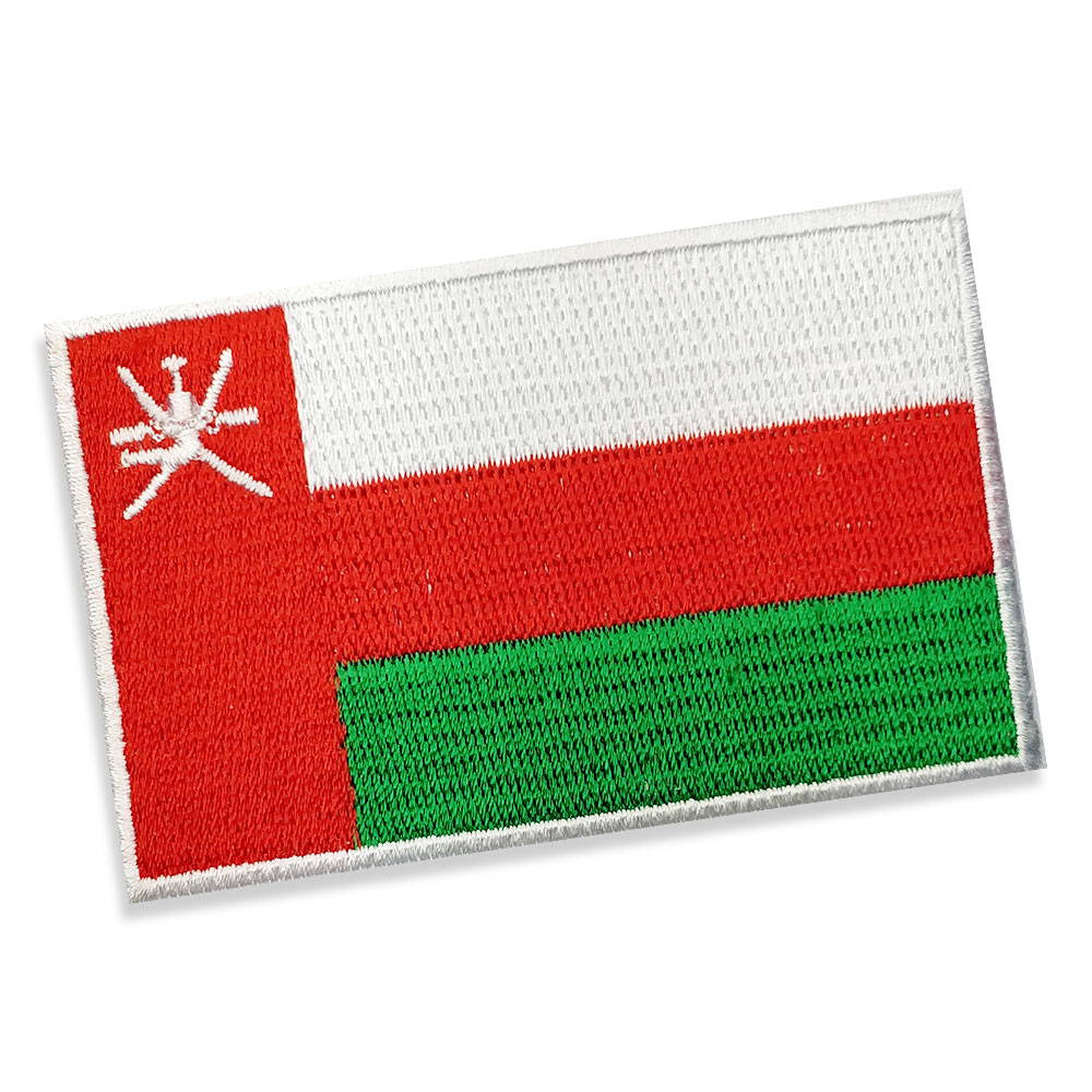 Oman Embroidered flag badge with heat seal backing RED PANTONE: PMS 186 C HEX (HTML): #C8102E; RGB: (200,16,46) CMYK: (2,100,85,6) GREEN PANTONE: PMS 347 C HEX (HTML): #009A44; RGB: (0,154,68) CMYK: (93,0,100,0)
